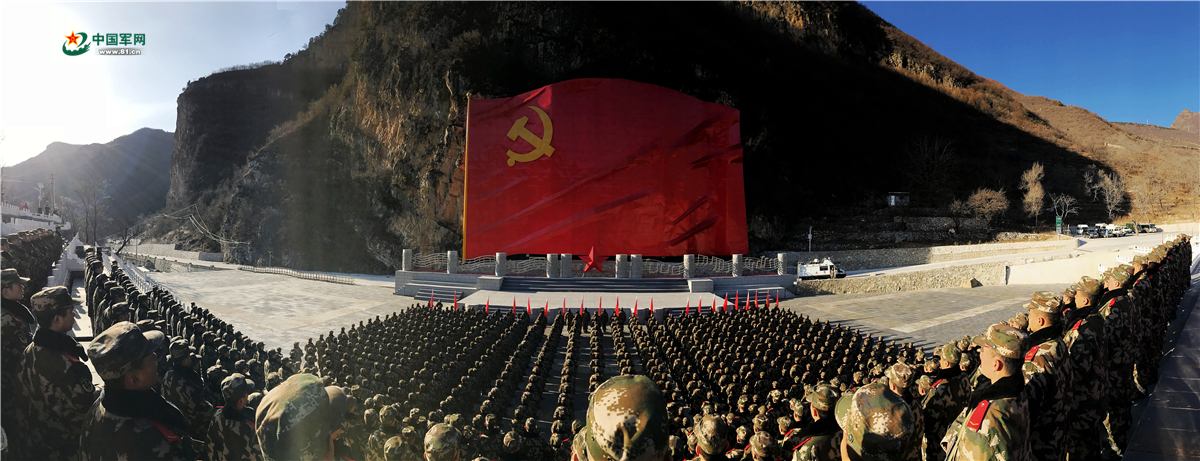 北风猎猎,党旗飘扬。位于霞云岭党旗广场上,坐落着一面全国最大的党旗,足足有960平方米,象征着祖国大地960万平方公里。“我志愿加入中国共产党,拥护党的纲领,遵守党的章程,履行党员义务,执行党的决定……”宣誓仪式现场,官兵们紧握右拳,面向党旗庄严宣誓,铿锵有力的誓言响彻整个山谷,震撼人心。全体官兵高唱《没有共产党就没有中国》歌曲,抒发了官兵爱党爱国的思想感情。