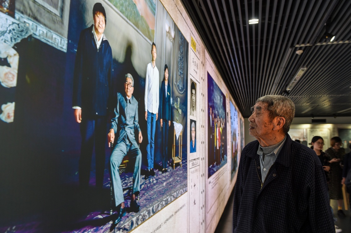 南京大屠杀幸存者马庭禄在《重生·繁衍——南京大屠杀幸存者家族影像展》上观看自己的家族合影。 新华社记者李博 摄
