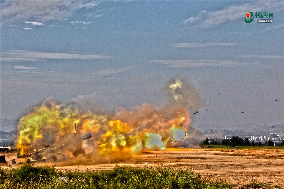 某型大口径榴弹炮齐射,火力覆盖目标区域,有效压制、摧毁敌有生力量。