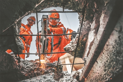 在一处有生命迹象的地点,救援官兵迅速展开搜救行动。搜索组携带搜救犬和电子搜索装备从受损建筑物边缘进入,对危险源和生命源位置进行标记;顶撑组利用扩张器和承重气垫对危险部位进行加固,防止发生二次坍塌;确认安全后,破拆组借助凿破、剪切装备在伤员受困位置打开生命出口……经过不懈努力,“受困人员”被成功救出。
