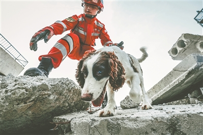 搜救队员携带搜救犬在废墟中寻找“幸存者”。
