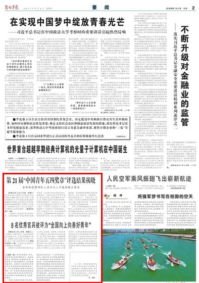 “中国青年五四奖章”是共青团中央、全国青联授予中国优秀青年的最高荣誉,旨在树立和宣传政治进步、品德高尚、贡献突出的优秀青年典型。第21届评选,全国共推报96名个人、32个集体,经团中央组织部审核、评委会投票初评、面向社会公示、团中央书记处集体研究,最终有20名个人荣获“中国青年五四奖章”、8个集体被授予“中国青年五四奖章集体”。军队3名获奖个人中,有专注国防科研攻关、获得国家和军队科技进步一等奖的青年专家,有立足本职岗位苦练技能、多次准确研判重要空情的预警尖兵,还有不惧生死、扎根维稳一线的武警忠诚卫士。在他们身上,充分展示了青年官兵积极投身改革强军伟大实践、争做“四有”新一代革命军人的坚定信念和精神风貌。