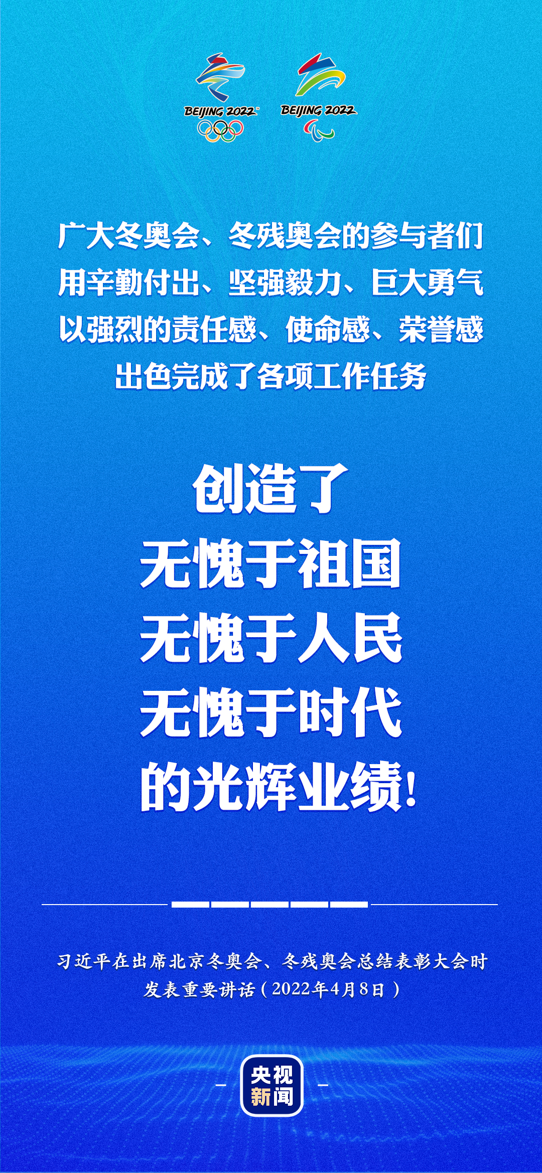 广大冬奥会、冬残奥会的参与者们,用辛勤付出、坚强毅力、巨大勇气,以强烈的责任感、使命感、荣誉感,出色完成了各项工作任务,创造了无愧于祖国、无愧于人民、无愧于时代的光辉业绩!
