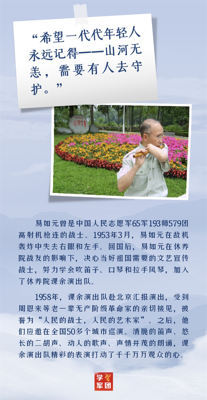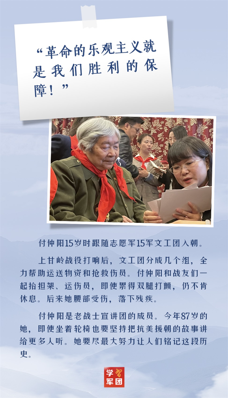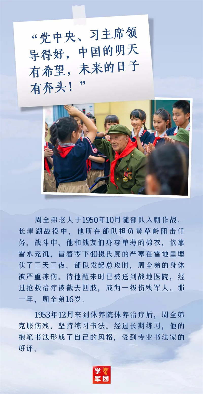 “在抗美援朝战争中,中国人民志愿军发扬伟大爱国主义精神和革命英雄主义精神,勇往直前,浴血奋战,为保家卫国作出了重要贡献。志愿军将士及英雄模范们的功绩,党和人民永远不会忘记。” 2020年10月,在中国人民志愿军抗美援朝出国作战70周年之际,习主席给四川省革命伤残军人休养院全体同志回信,高度肯定了志愿军将士的历史功绩,充分赞扬了他们身上体现的英雄精神。
