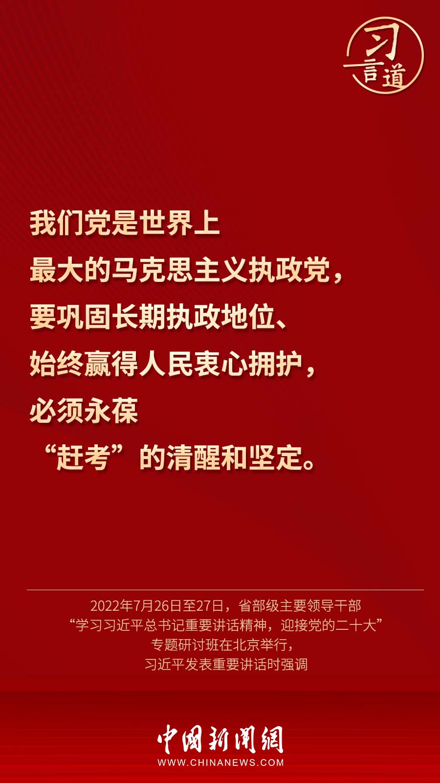 7月26日至27日,在省部级主要领导干部专题研讨班开班式上,习近平总书记发表重要讲话指出,必须永葆“赶考”的清醒和坚定。关于走好新的“赶考”之路,总书记曾强调——