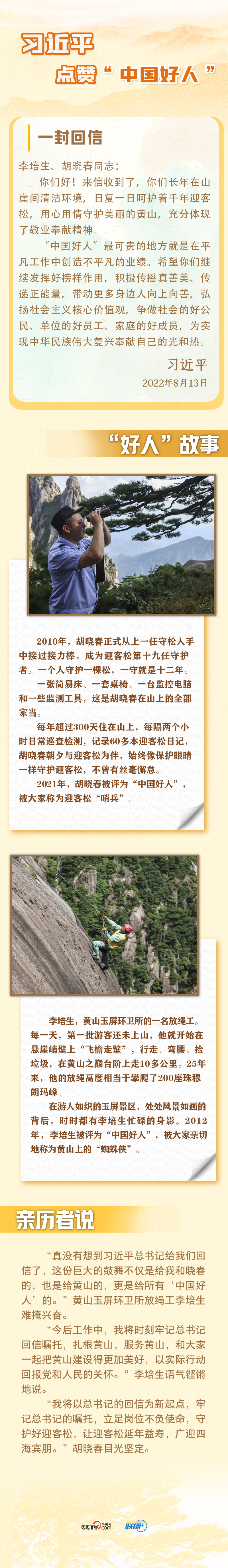 8月13日,习近平总书记给安徽黄山风景区工作人员李培生、胡晓春回信,对他们继续发挥“中国好人”榜样作用提出殷切期望。