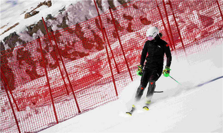 △中国高山滑雪队队员张玉营在北京冬奥会延庆赛区场地进行回转训练。(总台国广记者李晋拍摄)