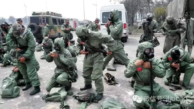 8月15日上午9时35分,天津滨海新区爆炸事故现场,北京军区某防化团60名身着防化服、头戴防毒面具的官兵组成10支小分队,挺进事故核心区域。