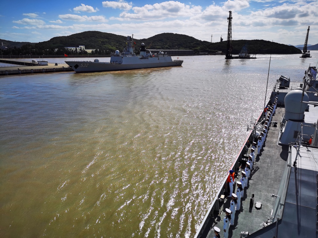 10月14日,中国海军第35批护航编队太原舰缓缓驶抵浙江舟山某军港码头,官兵在甲板列队站坡。新华社发(江山 摄)