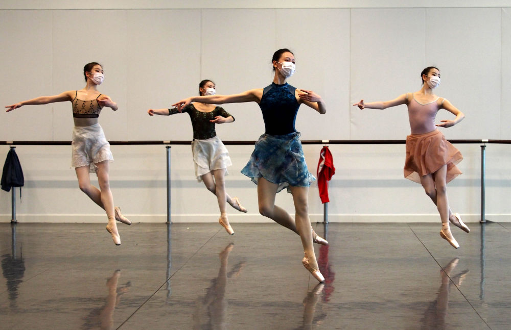 ↑2020年2月29日,上海芭蕾舞团演员项阳(右二)和同伴在通过网络直播的“公益公开课”上示范芭蕾舞基础动作。新华社记者 任珑 摄