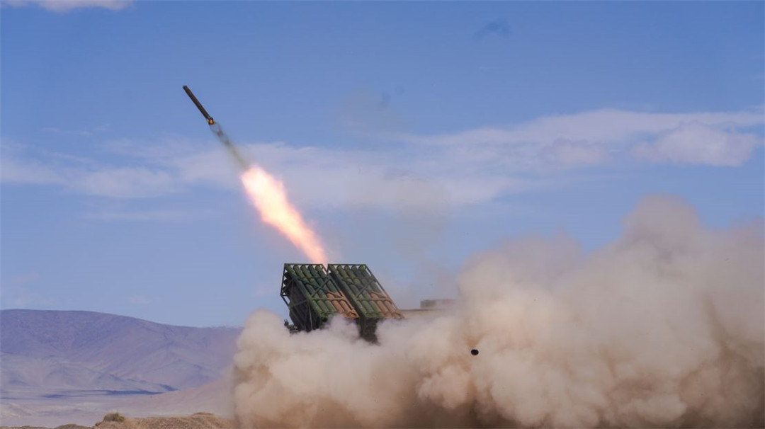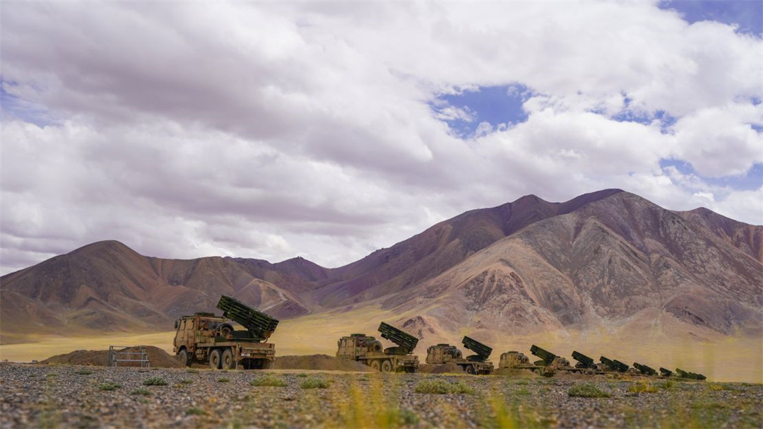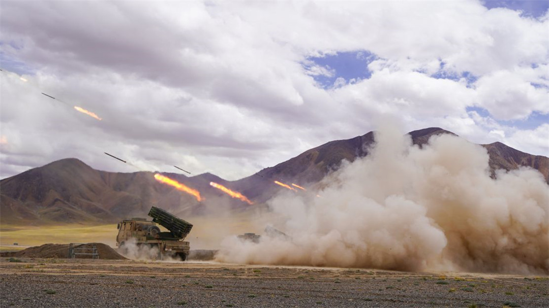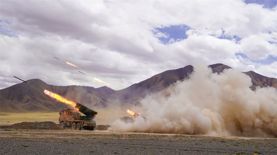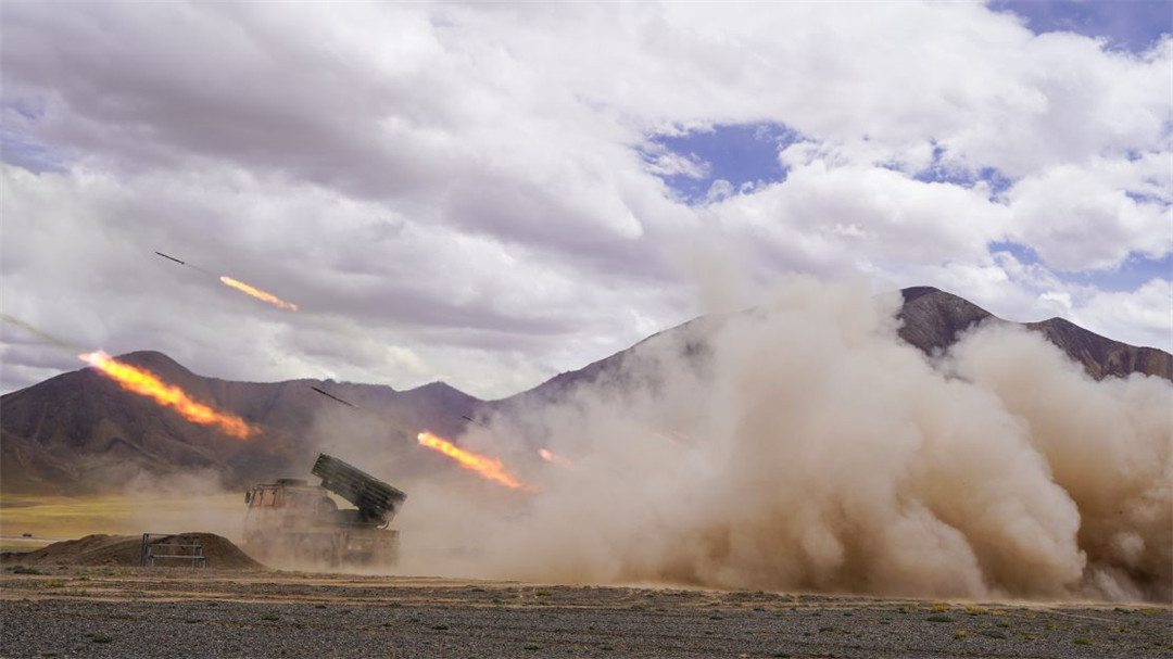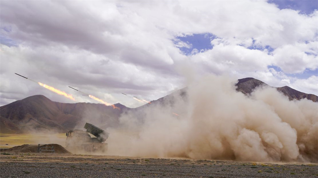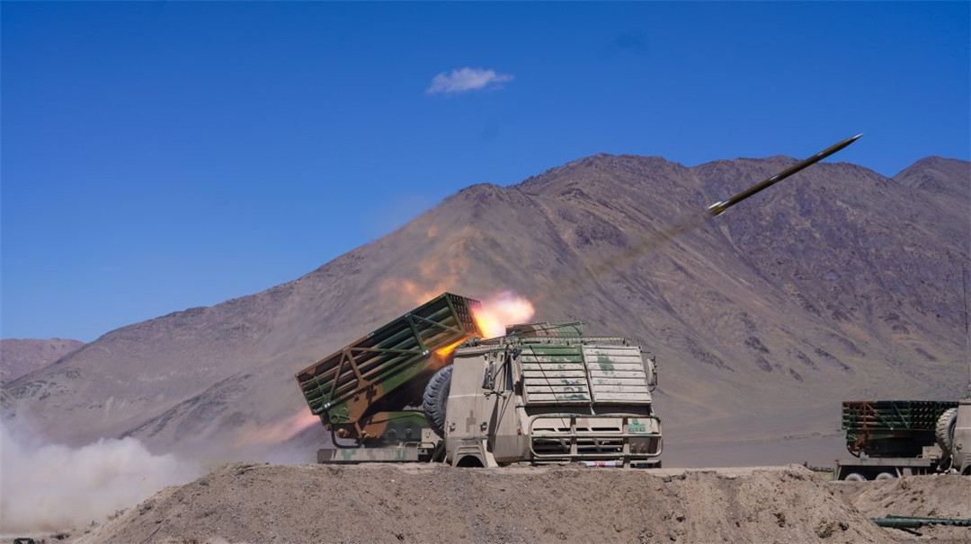 近日,陆军某火力团在海拔5300多米开展新型火箭炮实弹射击,有效检验部队精准火力打击能力。(陈继亮)