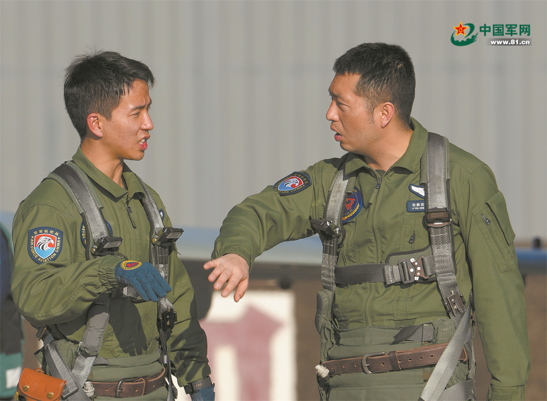 刚下战机,新员(左)与教官便讨论起战术动作。