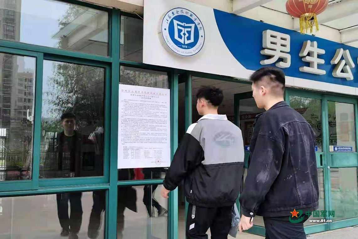 江苏安全技术职业学院的学生公寓门口张贴着征兵宣传海报,过往学生驻足观看。