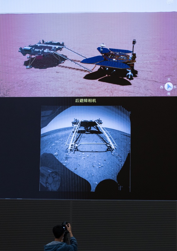 5月22日,在北京航天飞行控制中心,一名工作人员正在拍摄火星车驶离着陆平台画面。新华社记者 金立旺 摄