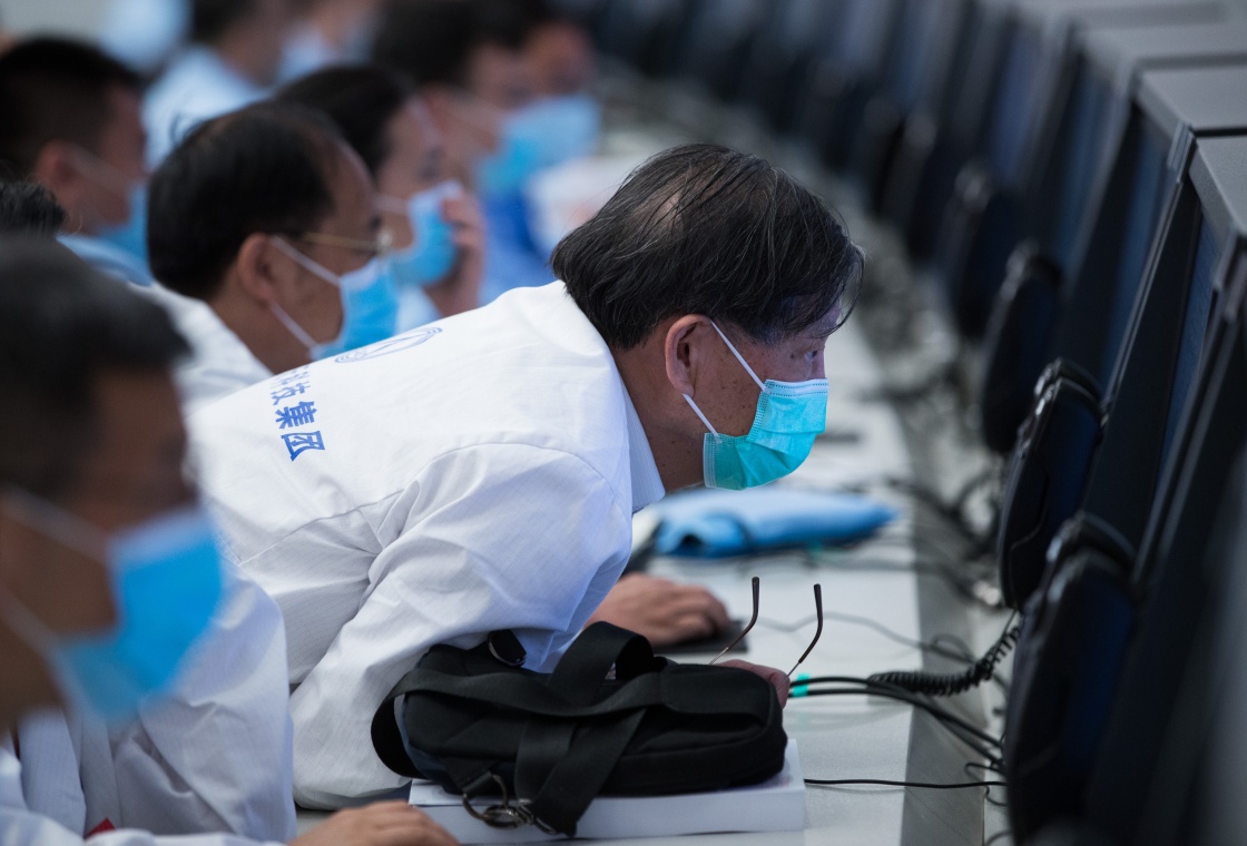 5月22日,在北京航天飞行控制中心,航天科研人员在监测火星车驶离着陆平台状况。新华社记者 金立旺 摄