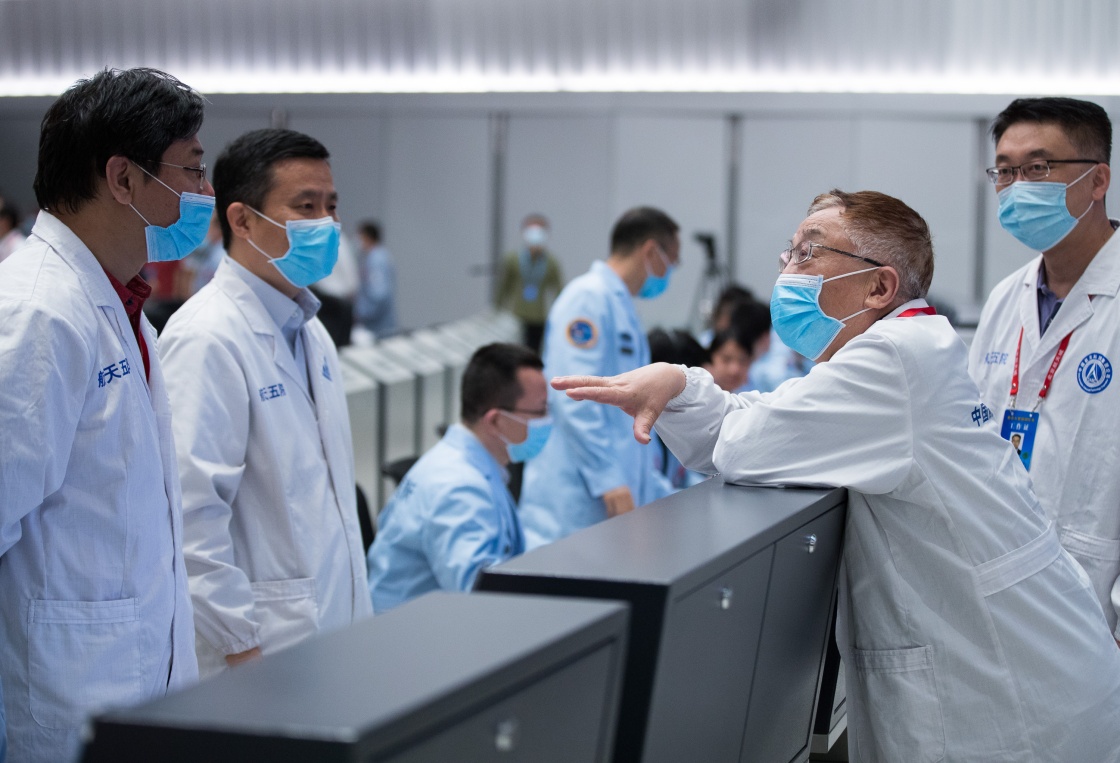 5月22日 ,在北京航天飞行控制中心,“祝融号”火星车安全驶离着陆平台后,中国航天科技集团五院技术顾问、中国科学院院士叶培建(右二)和天问一号火星探测器系统总设计师孙泽洲(左二)等专家在一起交流。新华社记者 金立旺 摄