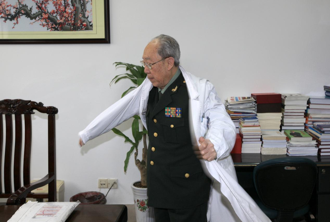 ↑吴孟超穿上白大褂,进入工作状态。他每天八点准时来到医院。王建民 摄