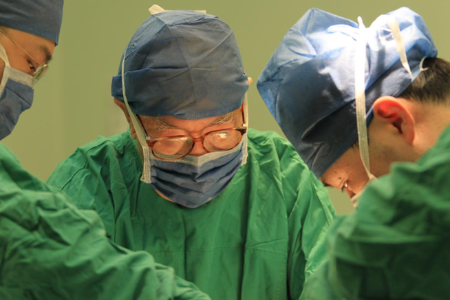 ↑吴孟超走上手术台,全神贯注地投入手术中。王建民 摄