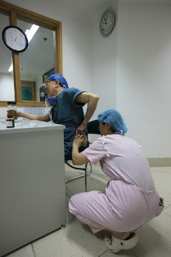 ↑换上手术服,准备进入手术室,主刀第一台手术。王建民 摄