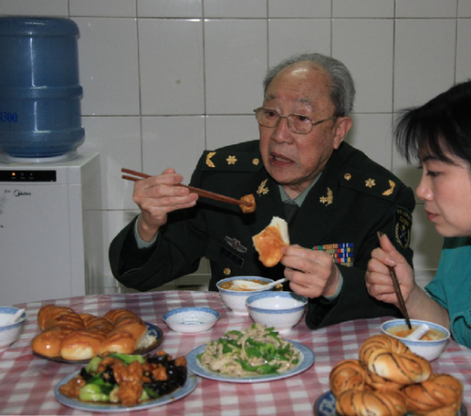 ↑吴孟超在医院食堂吃午餐,他喜欢吃面包,有时一天三顿都吃面包。王建民 摄
