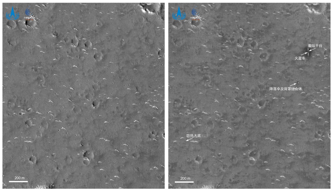 6月7日,国家航天局发布我国首次火星探测天问一号任务着陆区域高分影像图。图像中天问一号着陆平台、祝融号火星车及周边区域情况清晰可见。