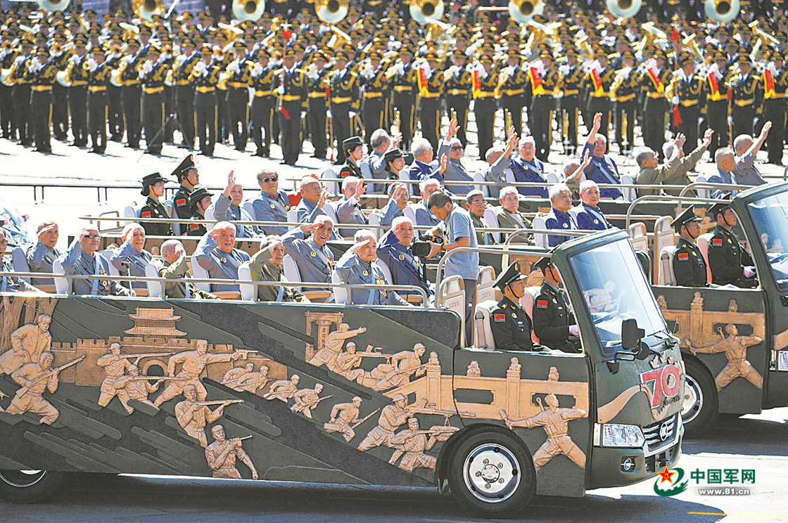 2015年9月3日,纪念中国人民抗日战争暨世界反法西斯战争胜利70周年大阅兵在北京举行。图为抗战老兵乘车方队通过天安门广场。