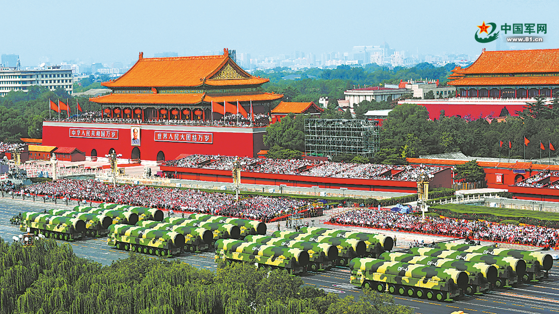 2019年10月1日,庆祝中华人民共和国成立70周年大会在北京天安门广场隆重举行。图为东风-41核导弹方队接受检阅。
