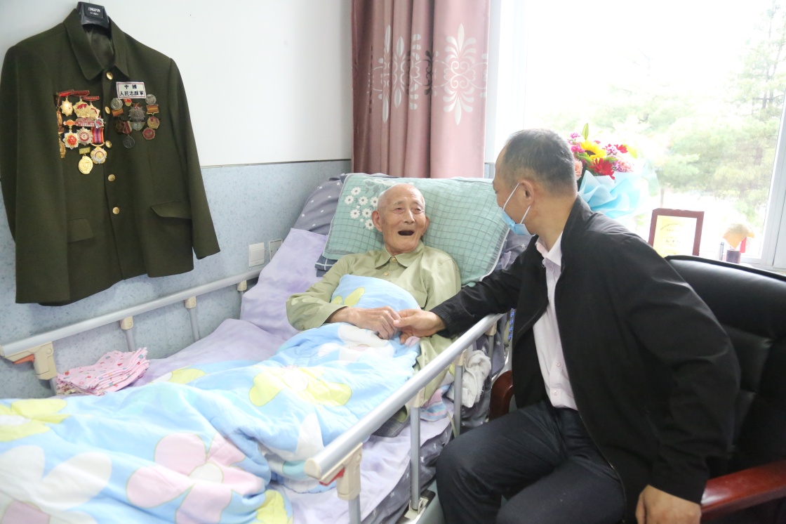 6月1日,抗美援朝老战士孙景坤在丹东光荣院与院长交谈。新华社发