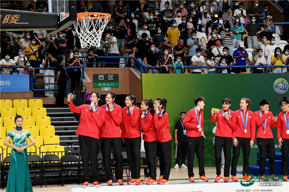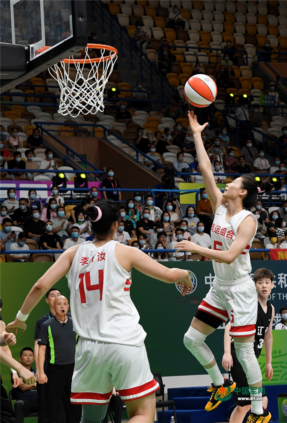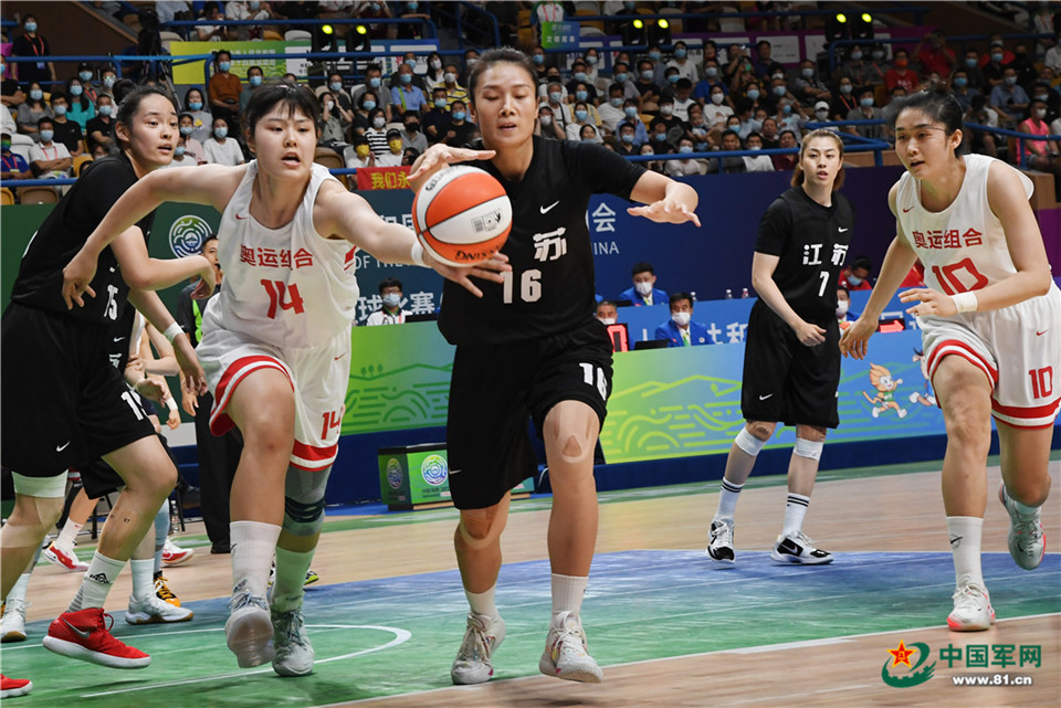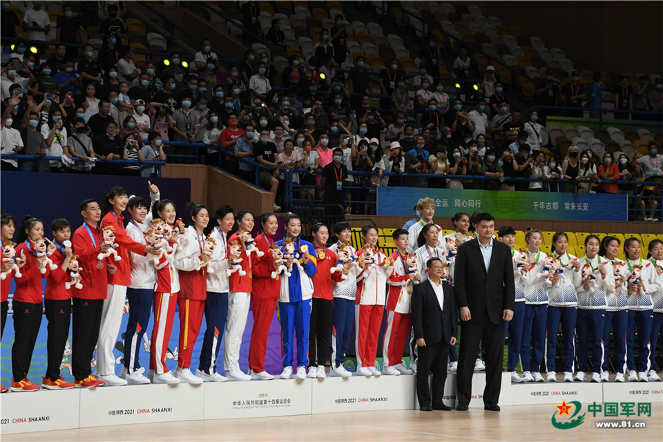 9月14日晚,在西安城市运动公园体育馆举行的第十四届全运会五人制篮球女子成年组决赛中,联合队以100比52战胜江苏队,获得金牌,江苏队和广东队分获银牌和铜牌。(解放军报记者王传顺 摄影报道)