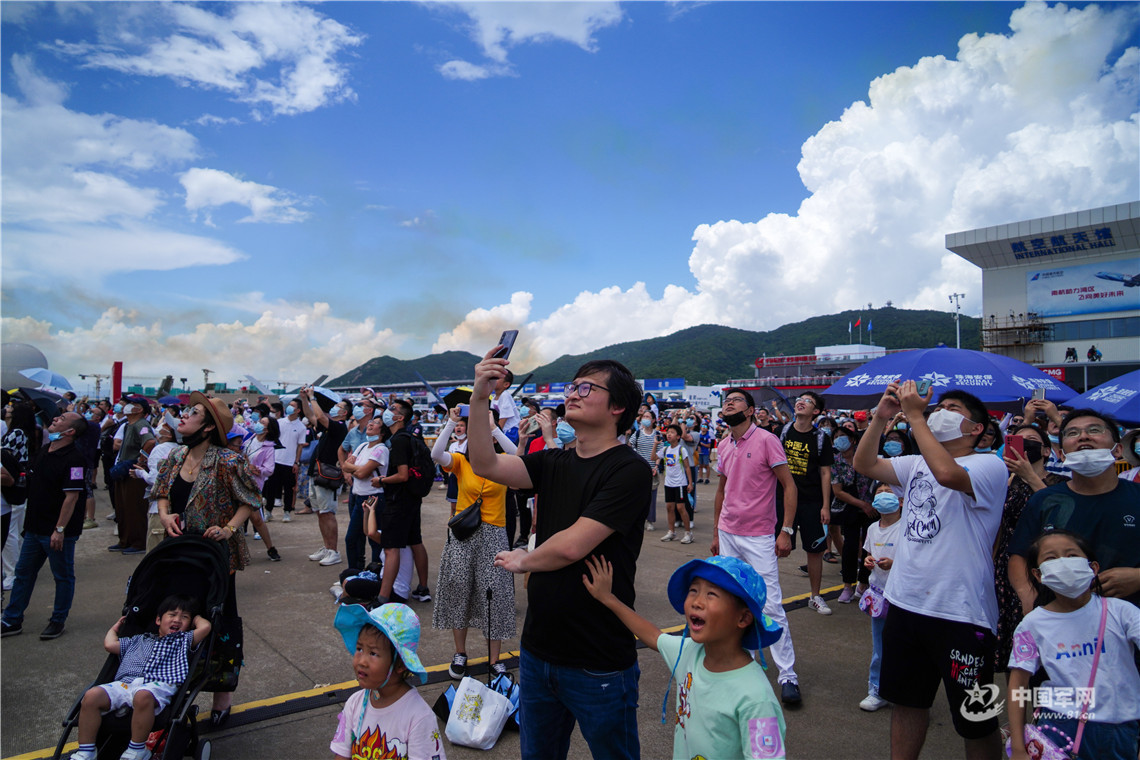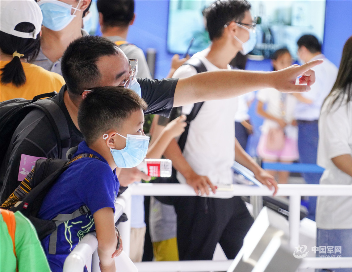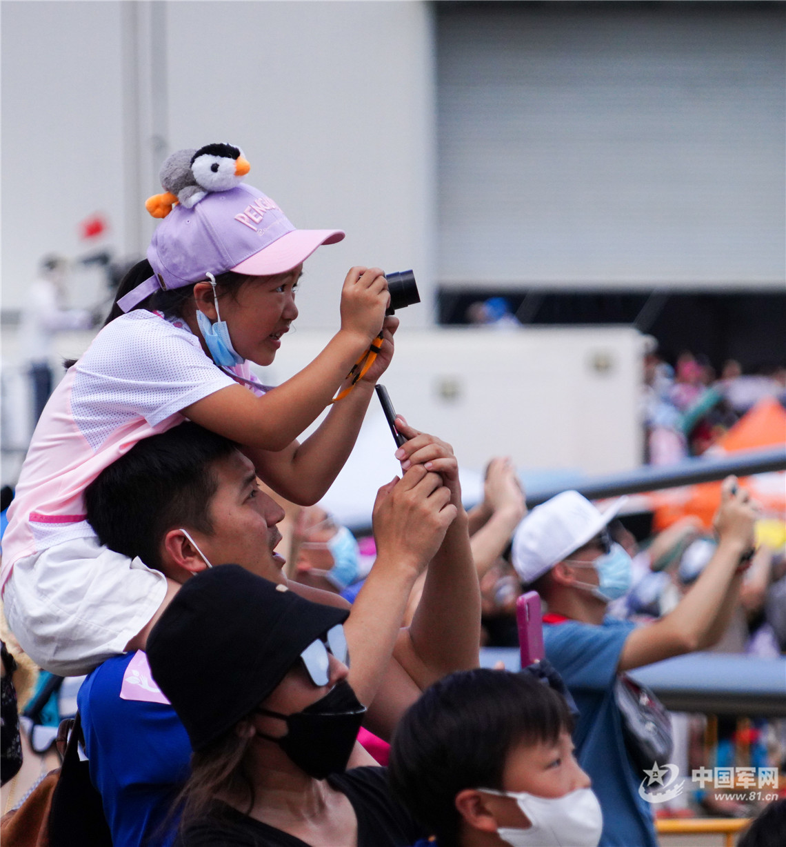 小军迷骑在家长肩膀上拍摄飞行表演。