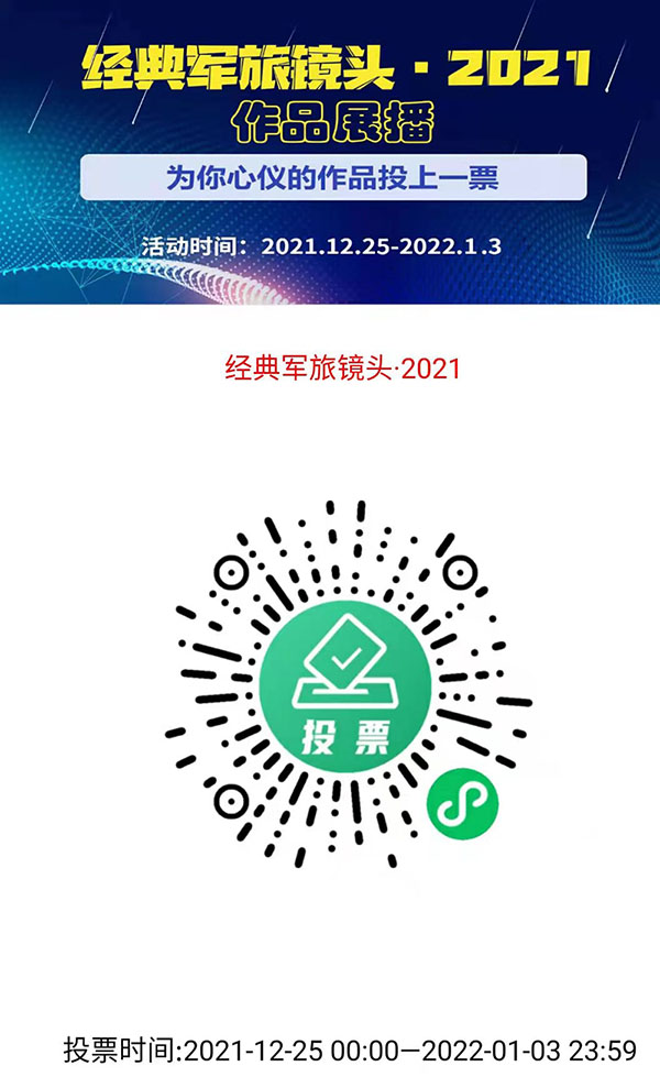2021年已近尾声,中国军网开展“经典军旅镜头·2021”优秀摄影作品网上展播活动。经过初评后,10类共354部作品脱颖而出,现进入网上投票阶段。欢迎广大网友积极参与,为您喜爱的作品投票。投票结果将作为入选的重要参考。
