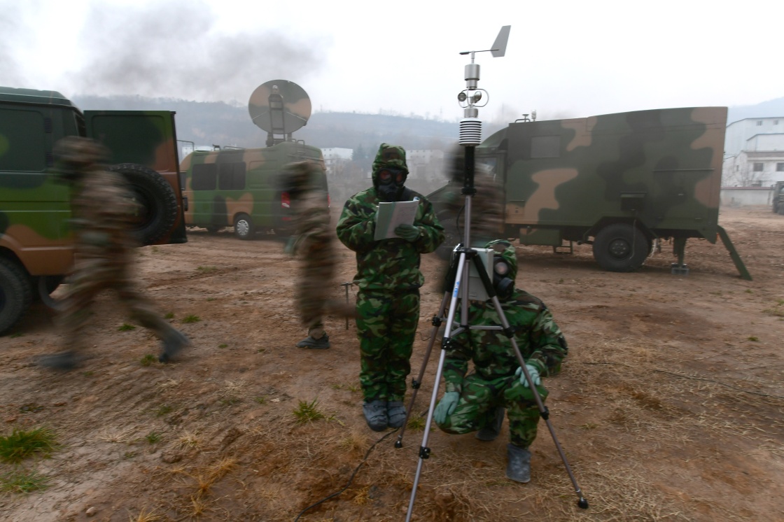 1月4日,火箭军某部气象分队官兵在训练场进行全防护状态下应急气象保障演练。