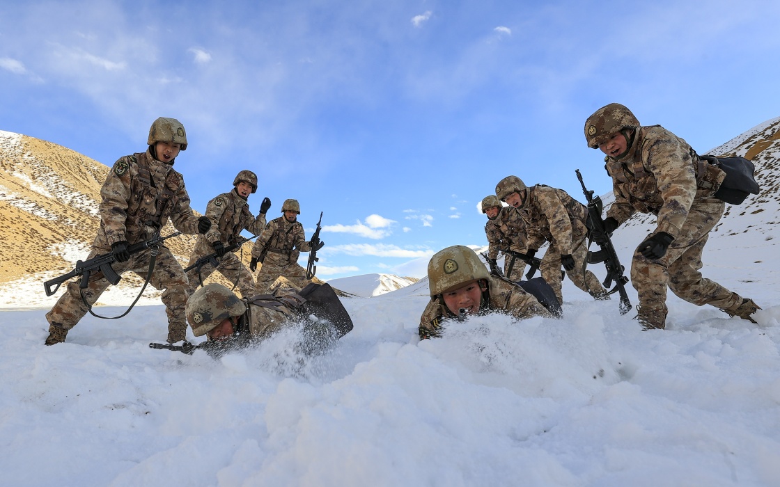 1月4日,驻守在西藏阿里高原的阿里军分区某边防团官兵在雪地进行战术比武。