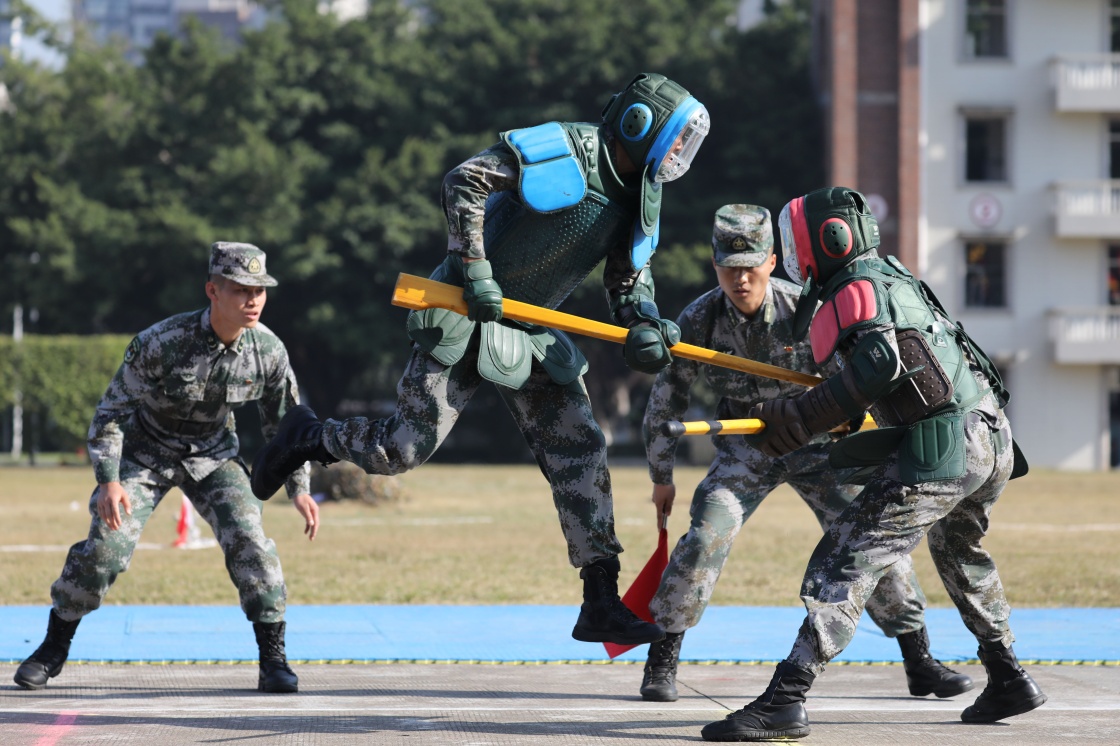 1月4日,驻澳门部队举行新年度开训,官兵们进行刺杀训练。