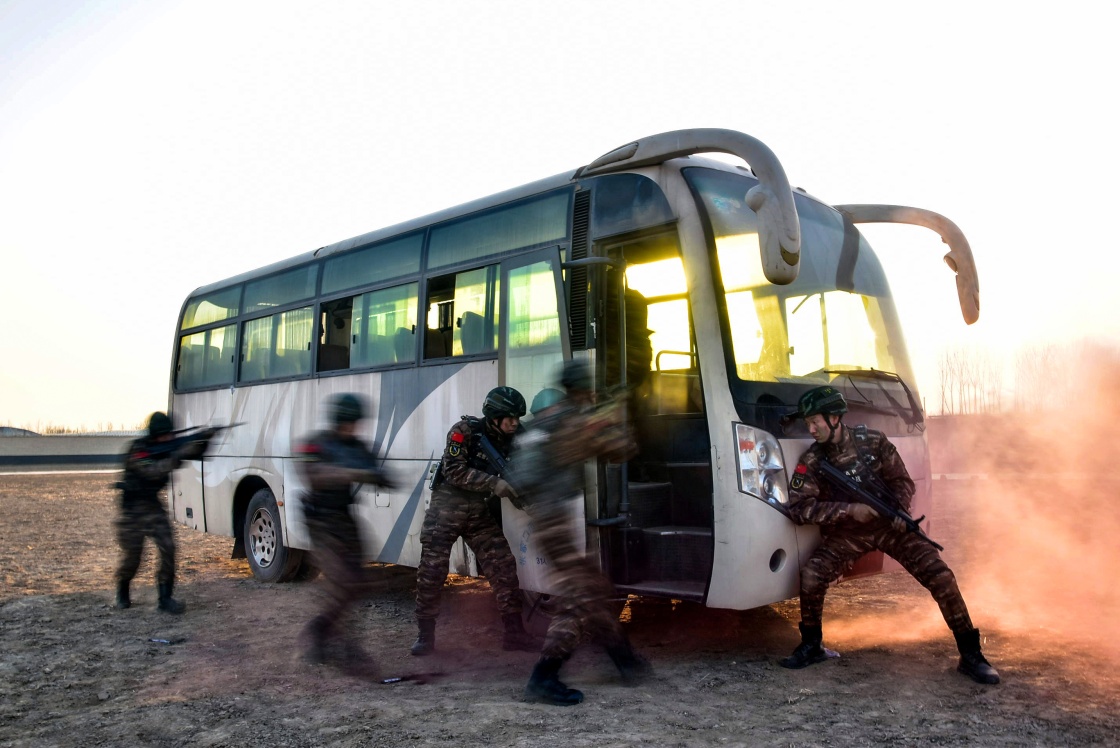 1月4日,武警北京总队执勤第四支队特战队员开展公交车反劫持训练。