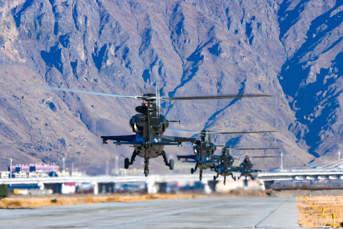 1月4日,在海拔3600多米的某演训场,西藏军区某陆航旅直升机编队起飞。