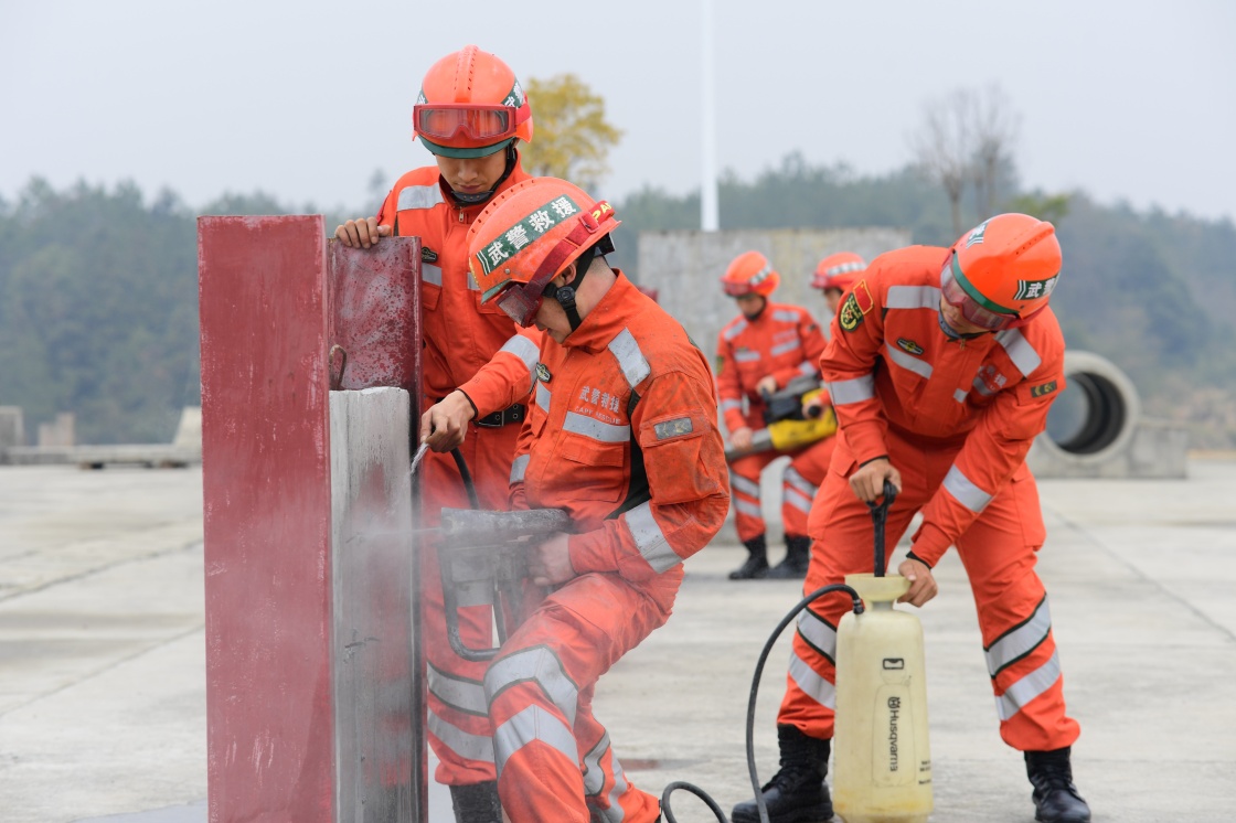 1月4日,武警江西总队机动支队组织救援专业训练,工兵中队官兵在切割水泥墙。