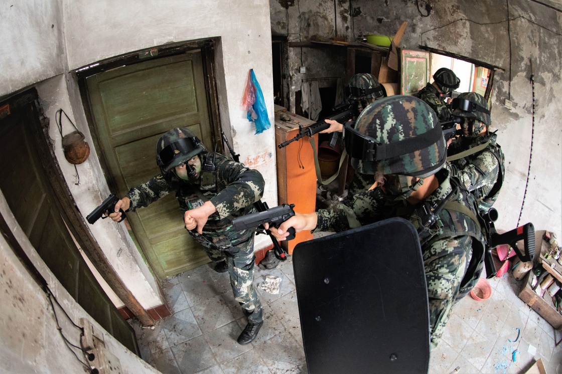 1月5日,武警广西总队北海支队官兵开展居民地反恐演练。