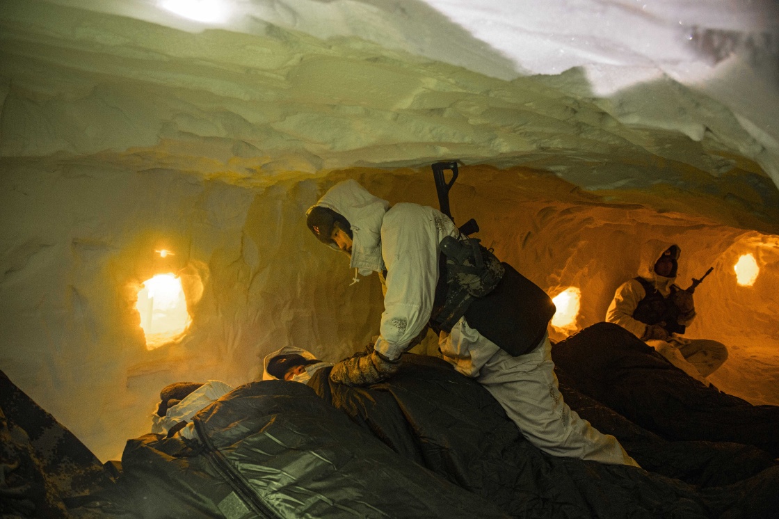 1月4日,北部战区陆军某边防旅东极哨所组织武装奔袭20公里,官兵在雪洞内野外宿营。