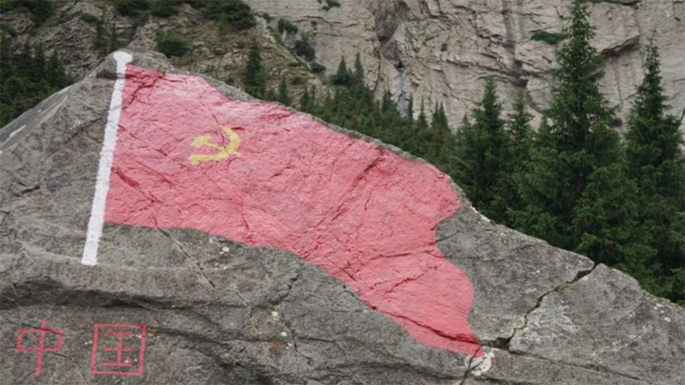 巡逻归来,在连队蹲点的副教导员艾尼瓦尔江·亚森用油漆在一块石头上作画,最后一缕阳光落下时,天山深处的石壁上,一面五星红旗耀眼夺目。