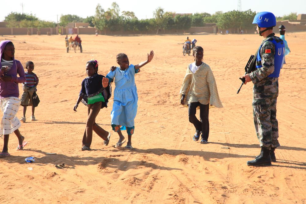 2014年1月27日,中国赴马里维和警卫分队在执行任务,路过的孩子向我维和士兵打招呼。