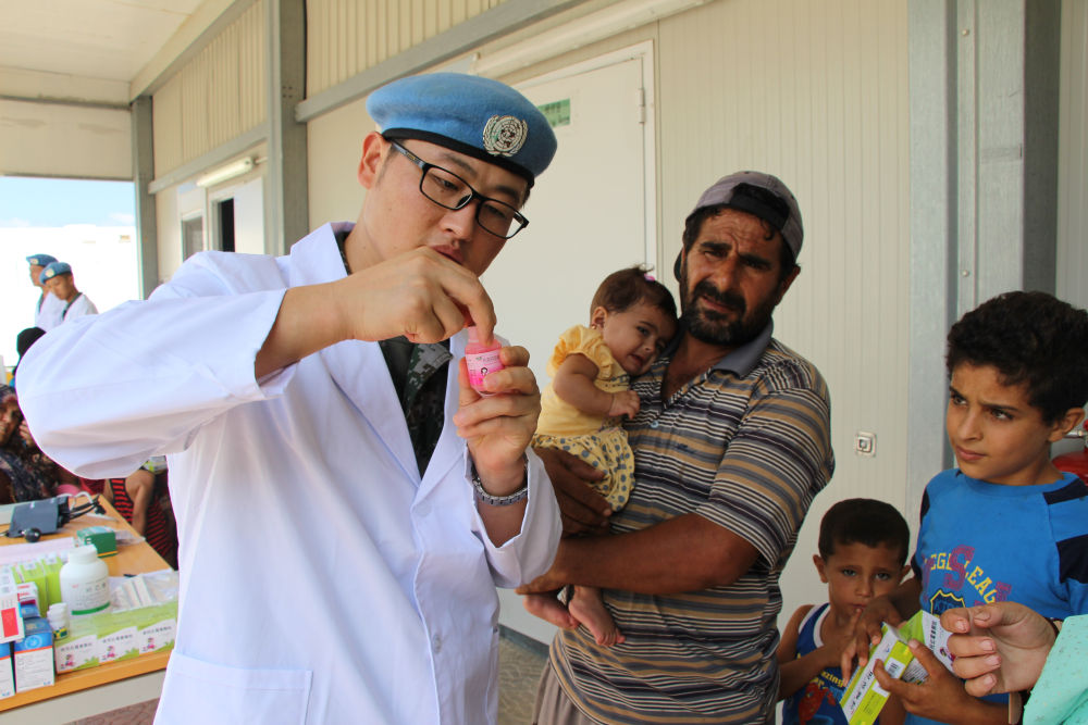 2018年8月19日,在位于黎巴嫩南部的中国维和部队营地医院内,中国维和官兵在义诊活动中向当地居民介绍药物使用方法。