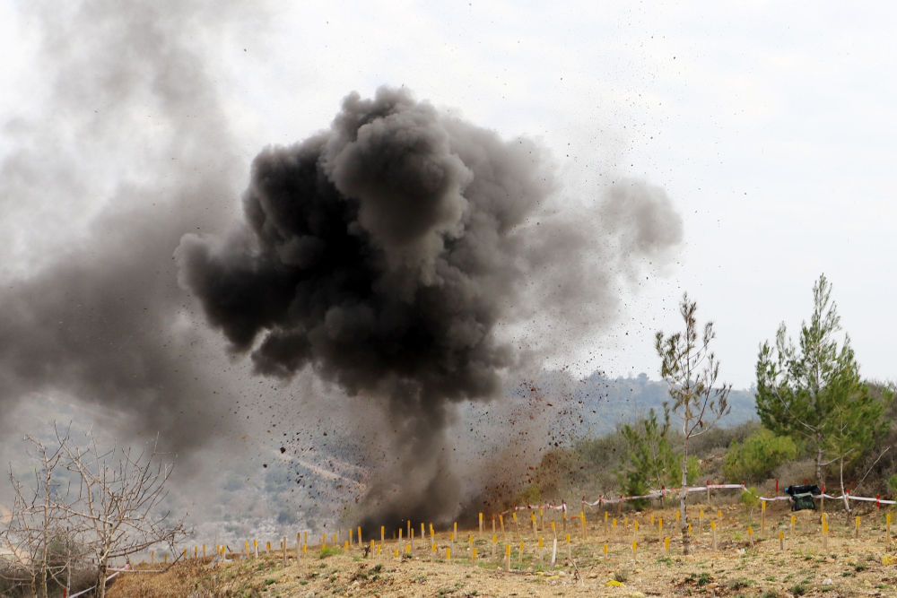 2020年1月17日,在位于黎巴嫩南部与以色列边境“蓝线”附近雷场,中国扫雷官兵引爆销毁最后两个作业通道清排出的地雷。