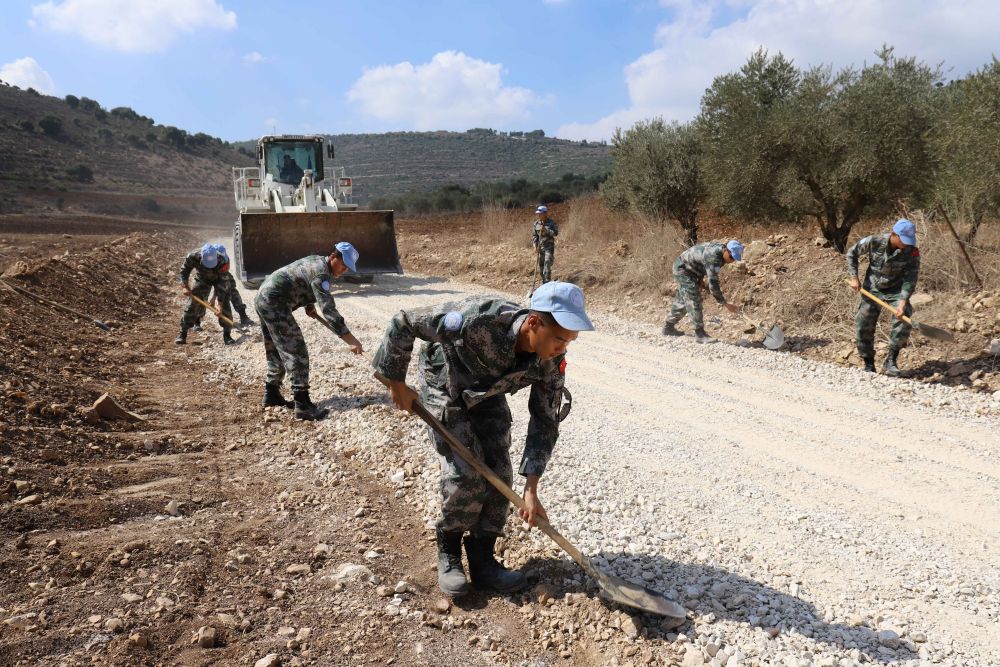 2018年10月10日,在位于黎巴嫩南部靠近以色列边境的一处村庄,中国维和官兵在修路过程中修整边沟。