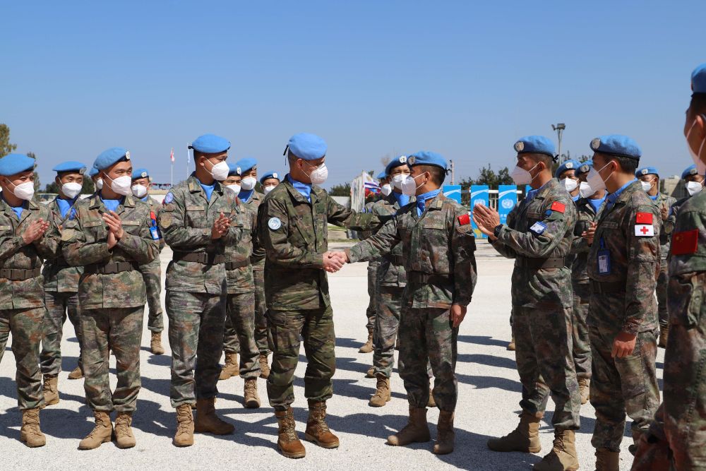2022年3月28日,联合国驻黎巴嫩临时部队(联黎部队)司令拉萨罗(前左四)在黎巴嫩南部辛尼亚村的中国赴黎维和部队营区视察。联黎部队司令拉萨罗日前在中国赴黎巴嫩维和部队营区视察时表示,中国维和部队为维护南黎地区和平发挥了重要作用。