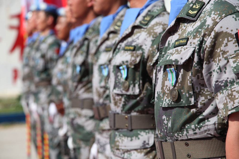 2018年4月6日,在黎巴嫩南部辛尼亚村的中国赴黎维和部队多功能工兵分队营区,中国维和官兵佩戴上联合国“和平荣誉勋章”。