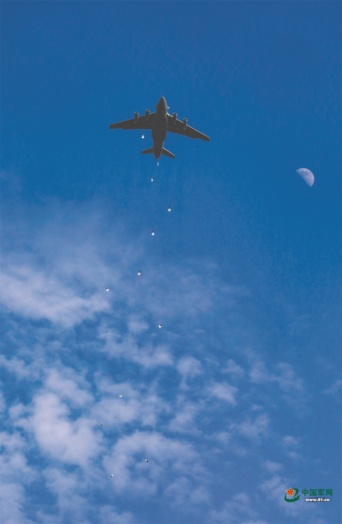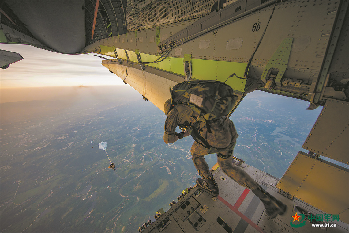 抵达预定空域后,特战队员勇敢跃出机舱。