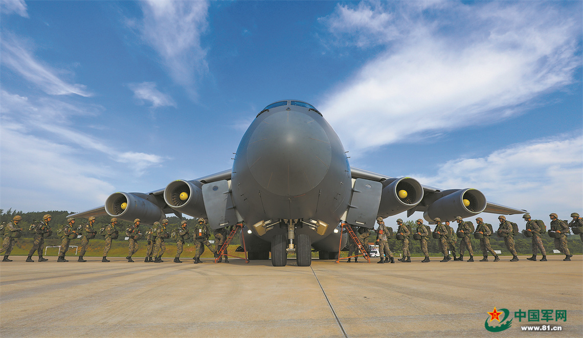 伴着嘹亮的口号声,特战队员有序穿戴伞具、披挂武器装备,随后按照作战编组快速登机。不多时,数架运输机呼啸升空,直插云霄。抵达预定空域后,舱门缓缓打开,特战队员手握拉绳、含胸、屈膝,做好伞降准备。“跳!”投放员下达命令,特战队员快速跃出机舱。转瞬之间,数千米高空绽放出朵朵伞花。