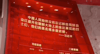 △“纪念中国人民志愿军抗美援朝出国作战70周年主题展览”,红色玻璃幕墙上镌刻着抗美援朝英烈模范的姓名。