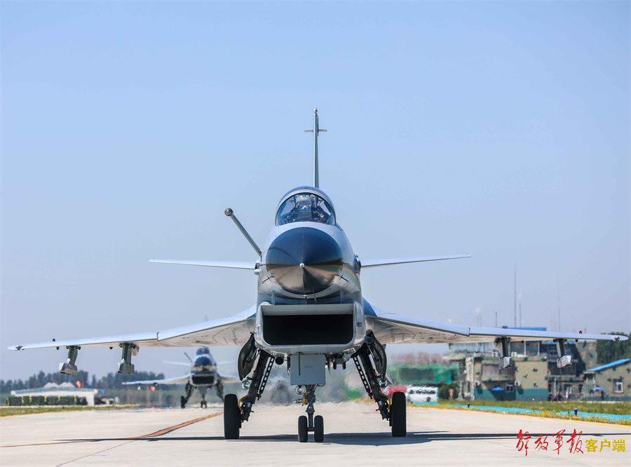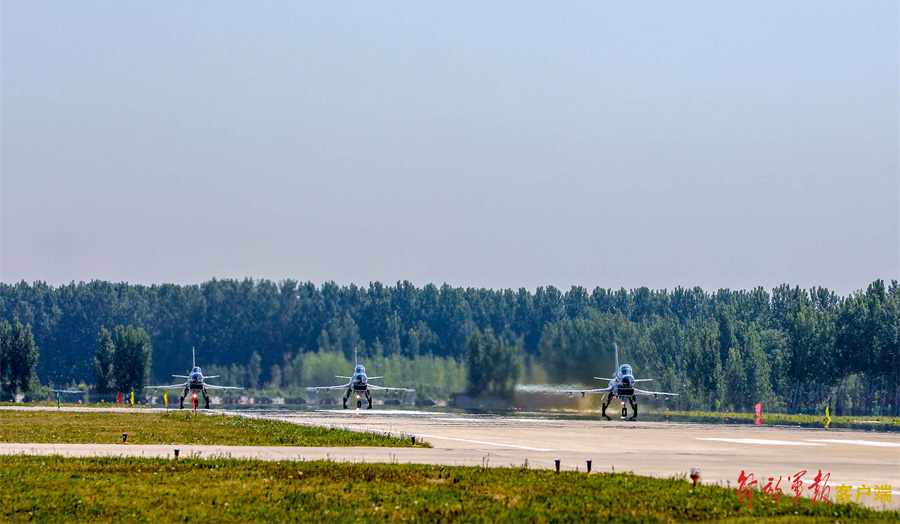 “计时起飞!”随着指挥员一声令下,机场跑道上,数驾梯次滑出,加力腾空而起,在蔚蓝的空中划出了一道道绚丽的航迹。